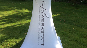 Wir verleihen hochwertige Stehtisch-Hussen „Galactica“* der Firma hms-easy-stretch in zu einem sensationellen Preis von 15,50 Brutto